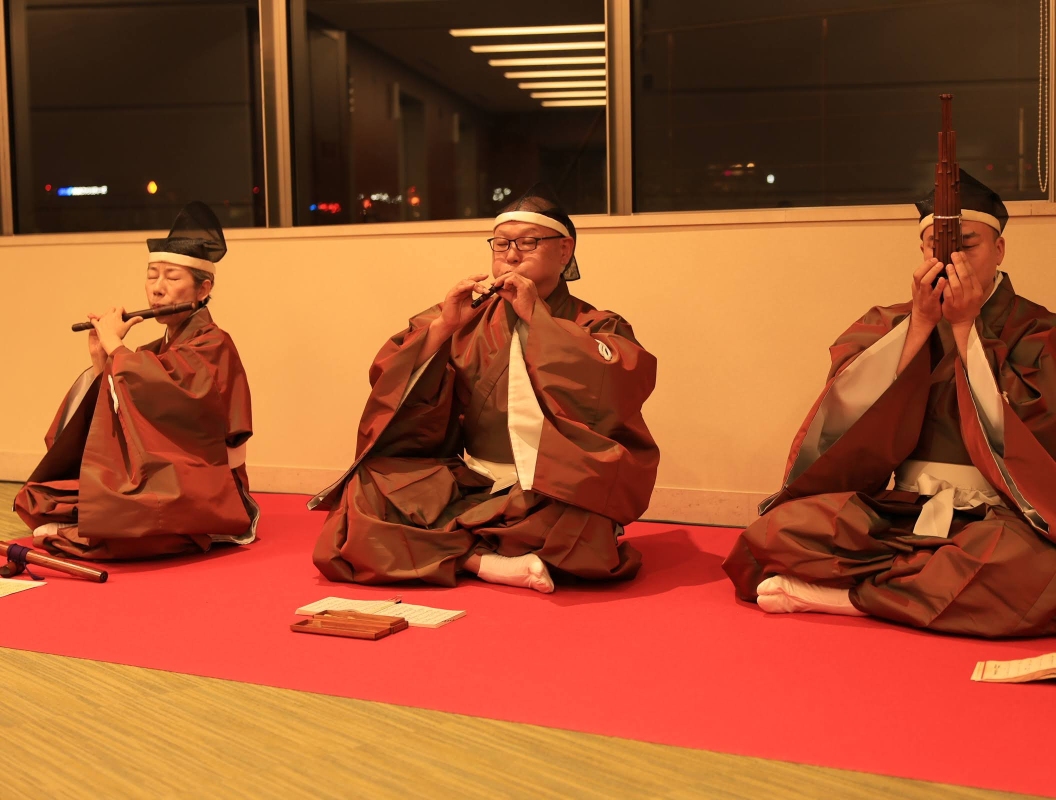15名の参加者が集まり、ヨガマットの上でゆっくりと呼吸を整える時間が始まります。この日、会場に響いていたのは、一般社団法人 大阪楽所(おおさかがくそ)による雅楽の生演奏。宮中から伝わる正統な雅楽を継承する団体として活動する大阪楽所の奏者3名が、本格的な装束をまとって登場。その音色が、いつものヨガ空間をまったく異なる趣へと導いてくれました。