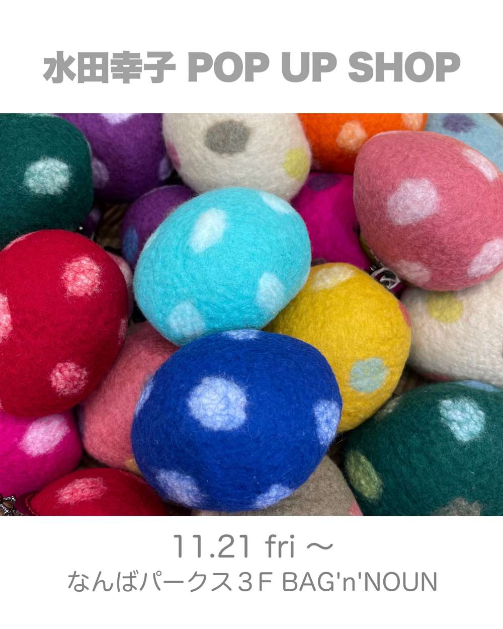 こんにちは。BAG'n'NOUNです。 水田幸子氏のハンドメイドフェルト展示、販売のお知らせです。 【水田幸子】 大阪市在住。 ハンドメイドフェル...