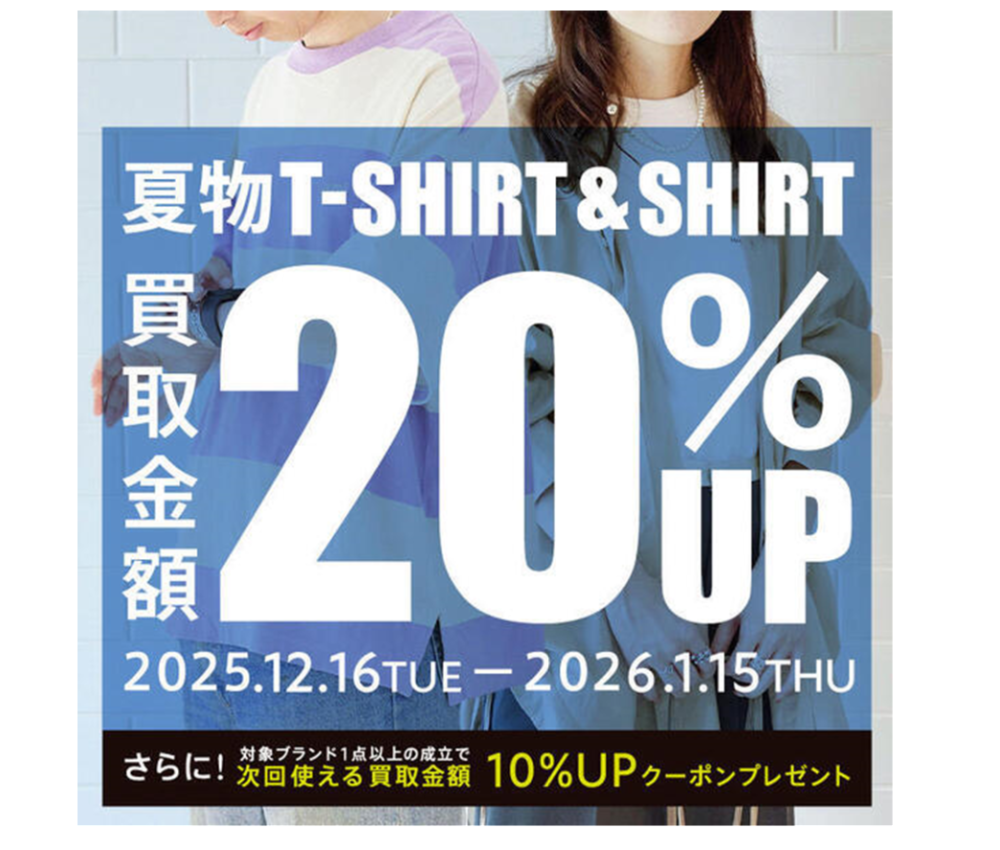 12月16日(火)から1月15日(木)まで、RAGTAGにて、夏物Tシャツ&シャツの買取金額20%UPキャンペーンを開催いたします。 期間中は夏物Tシ...