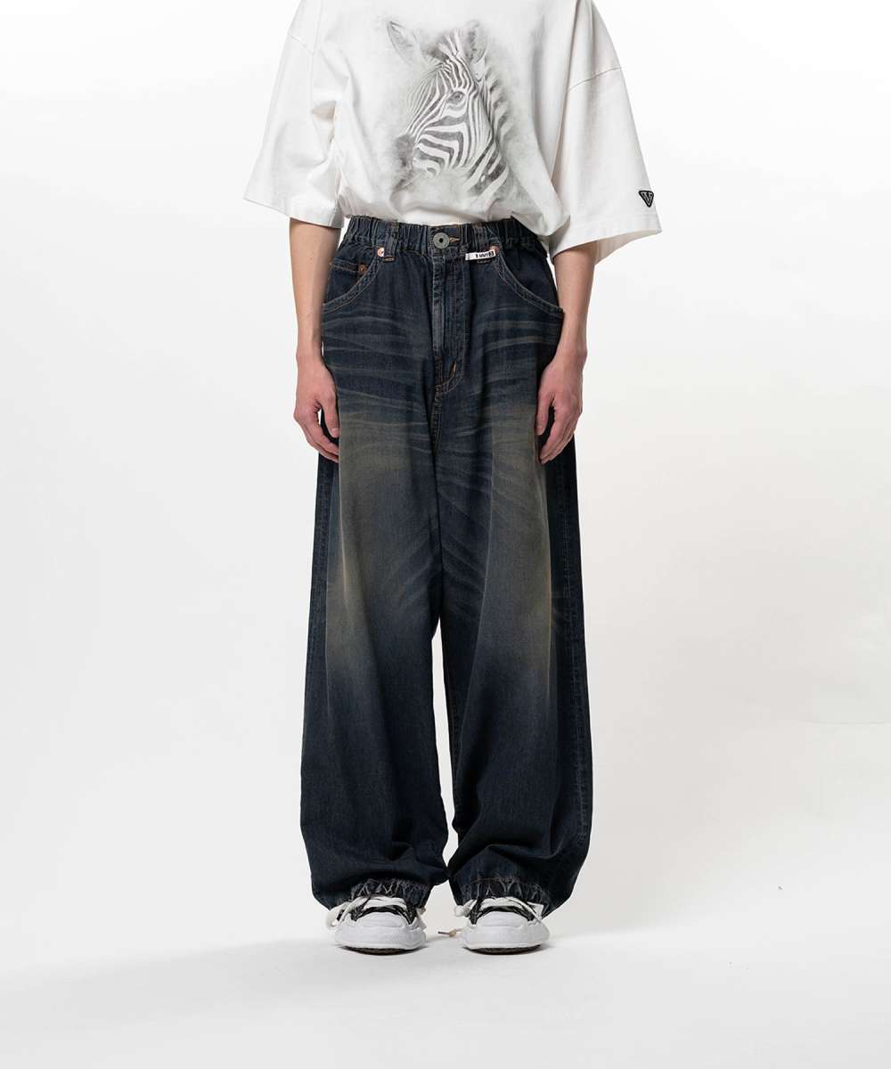 ミハラヤスヒロでは定番のライトデニムシリーズです。 生地に色落ち加工を施したワイドパンツ。 裾はドローストリング付きなので絞って履いていただくことも可...