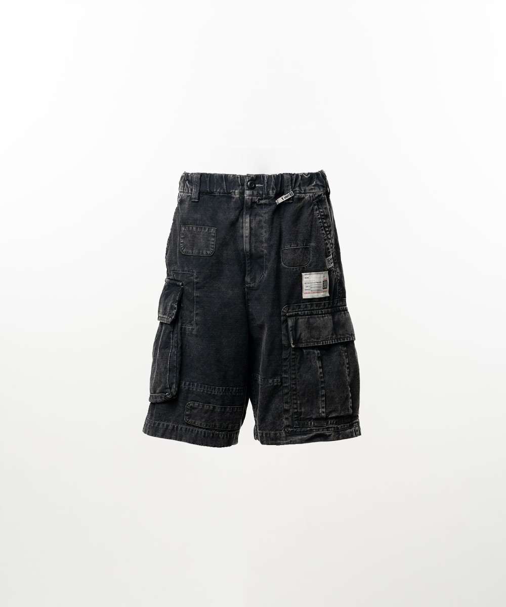 コットン素材のカーゴショーツ。 リペア加工を施し、着古されたような風合いを表現。 サイド、バックポケット。 ウエストゴム、ループ仕様。ウエスト紐を付属...