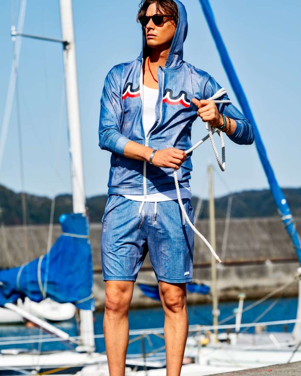 トップス ¥13,200- カラー:ネイビー・オレンジ サイズ:S-XL パンツ ¥17,600 カラー:ライトインディゴ・インディゴブルー サイズ...