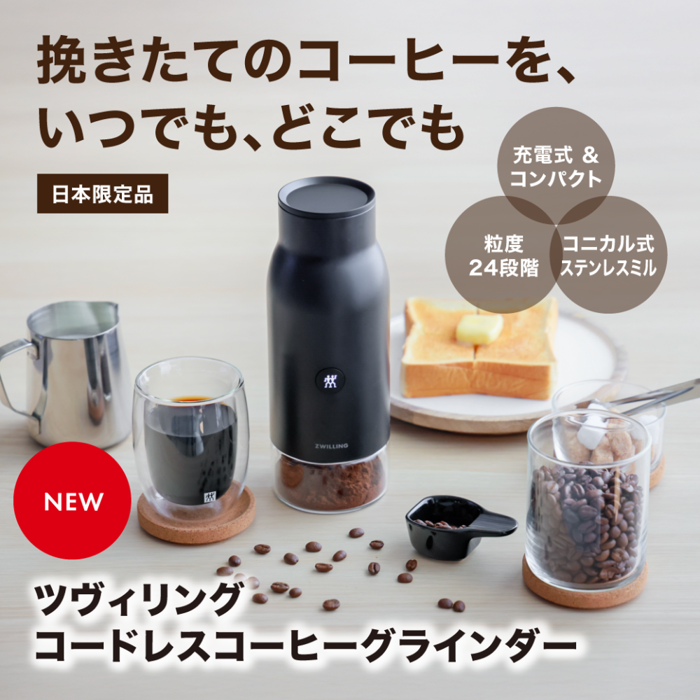 ツヴィリングブランドから日本限定アイテムとして、コードレスコーヒーグラインダーが新登場! 充電式のコードレスタイプで、スタイリッシュなマットブラック...