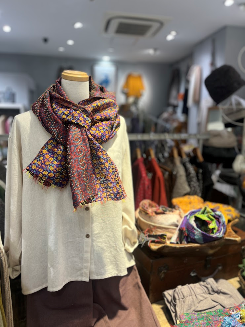 ⚫︎カンタスカーフ ヴィンテージシルクの生地に、 手仕事で一面に刺し子が施されています。 両面とも全く雰囲気が異なるため、気分によって リバーシブル...