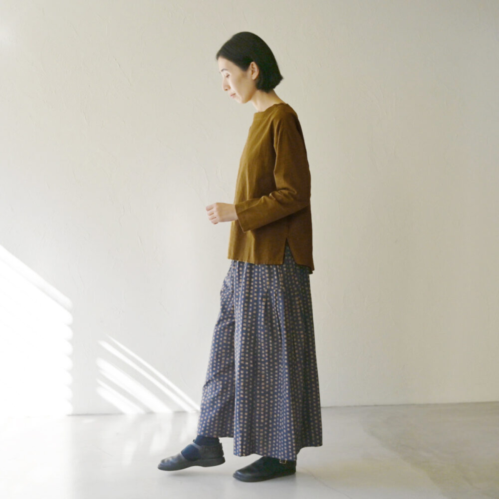 柄のパンツと合わせて少しレトロな印象に。