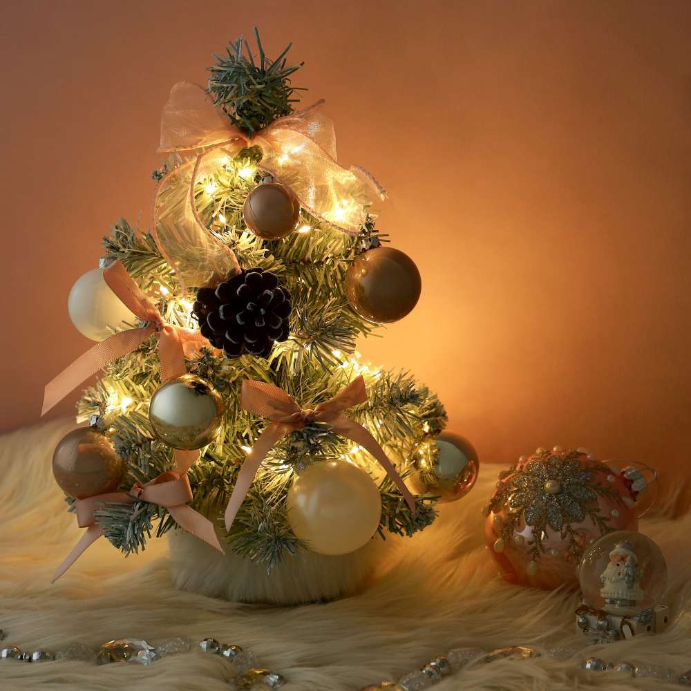 ファッションのトレンドでもあるリボンのオーナメントや、デザインの異なるオーナメント、ライトもついているので小さいながらも存在感は抜群◎