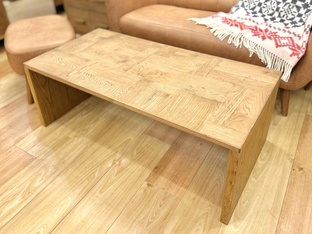 美しい木目がモザイク状に組まれた天板と、