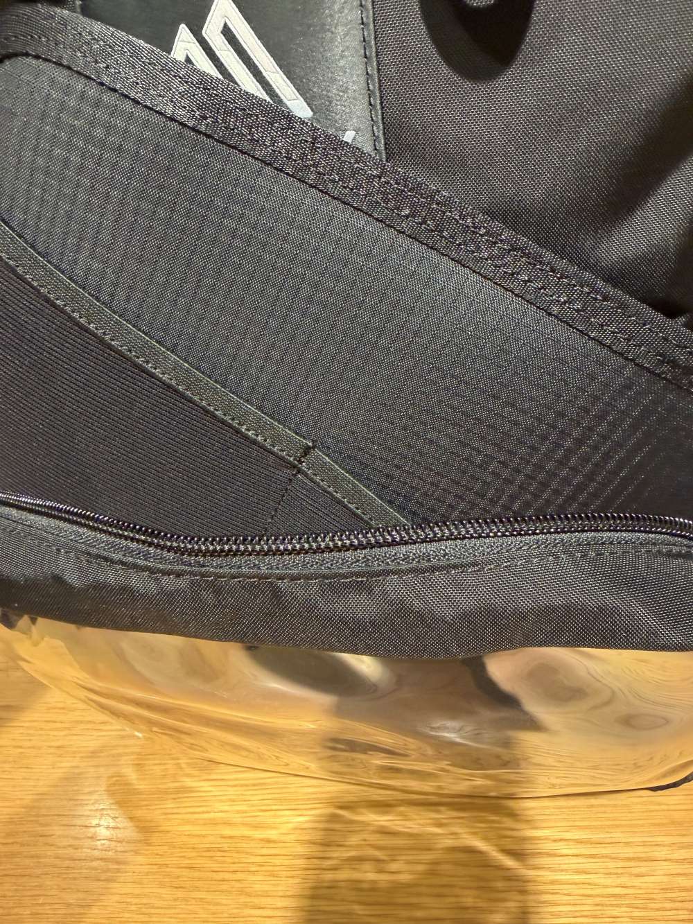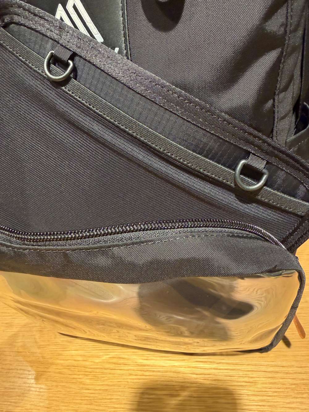 フロント上部にはカラビナ、フロントポケットはクリアポケットになり、