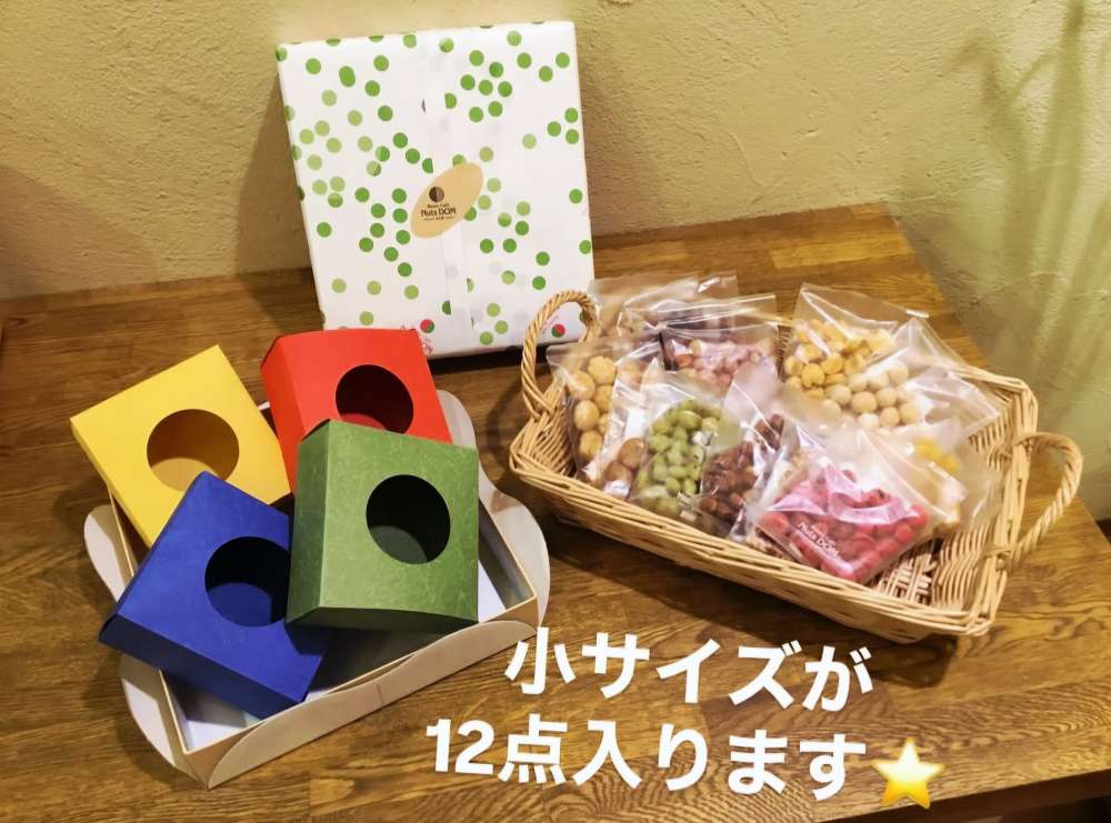 ↑こちらは最初にご紹介した平らなお箱に内箱を使い、小サイズを12点ほどお詰め合わせいただけます。カラフルで豪華です✨