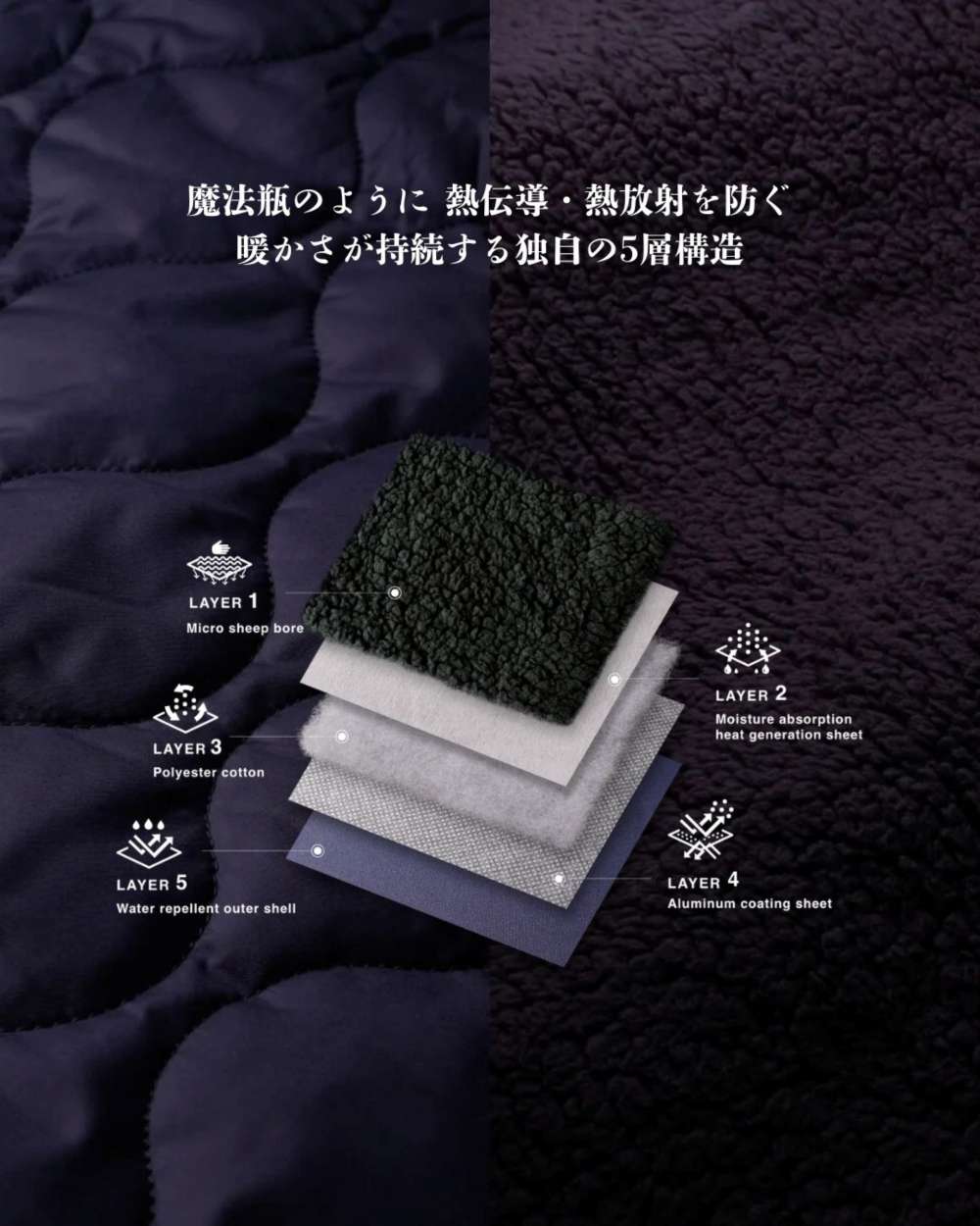更に、肌に直接触れる部分にはマイクロシープボアを使用しているので肌触りがよく、触れた瞬間から“暖かい”を感じられます。