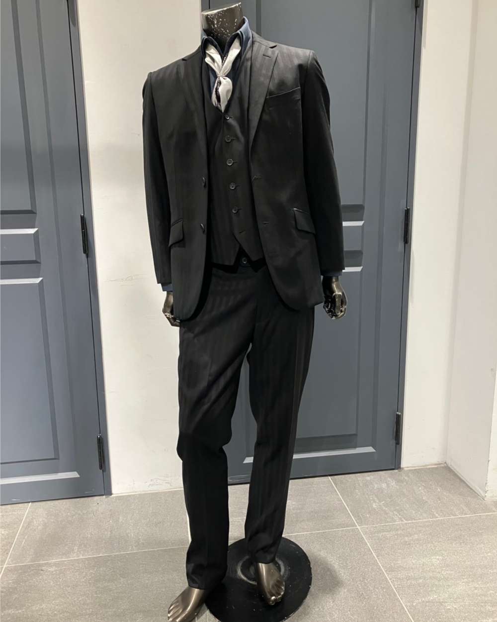 ジャケットはシングル2つボタンタイプでベストは襟なし6個ボタンパンツはノータックタイプと