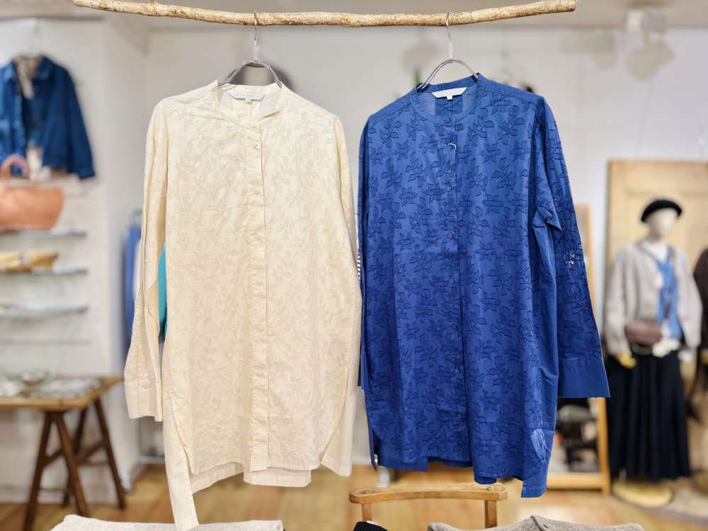 リンドウの花をモチーフにしたシアー感のあるシャツ。