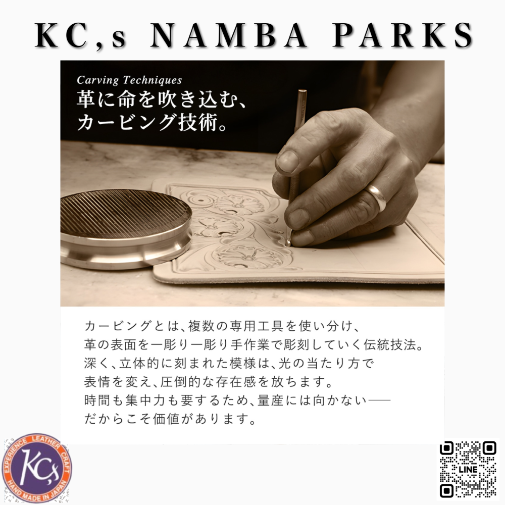 カービングとは、数種類の専用工具を使い分け、革に直接手彫りで柄を刻み込む高度な技法です。熟練の職人が一つひとつ丁寧に仕上げることで、機械では決して表現できない立体感と奥行きが生まれます。同じデザインであっても、微妙な表情の違いが生まれるのはハンドメイドならではの魅力です。