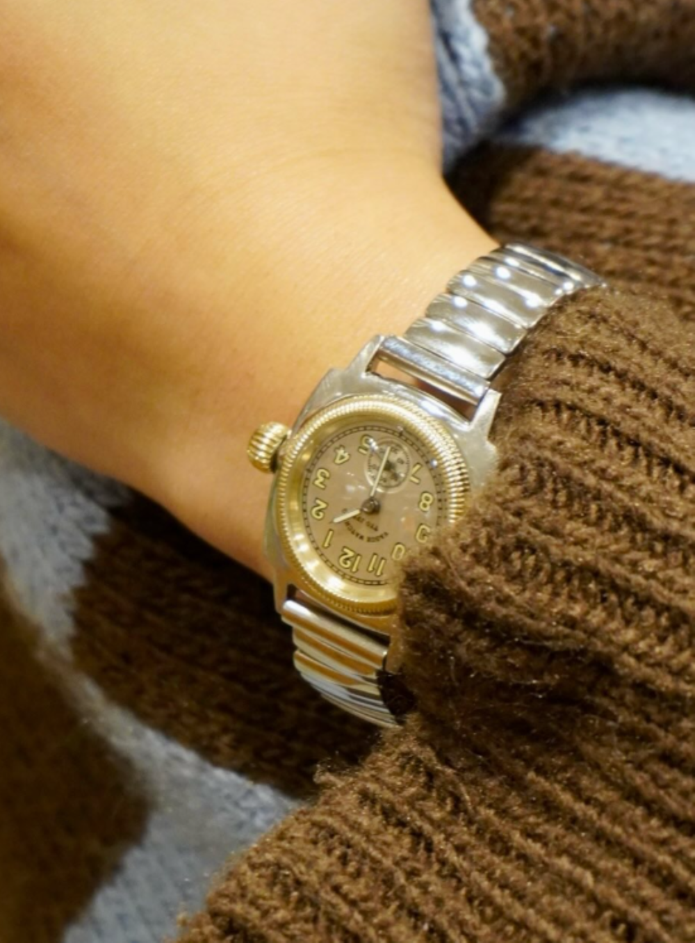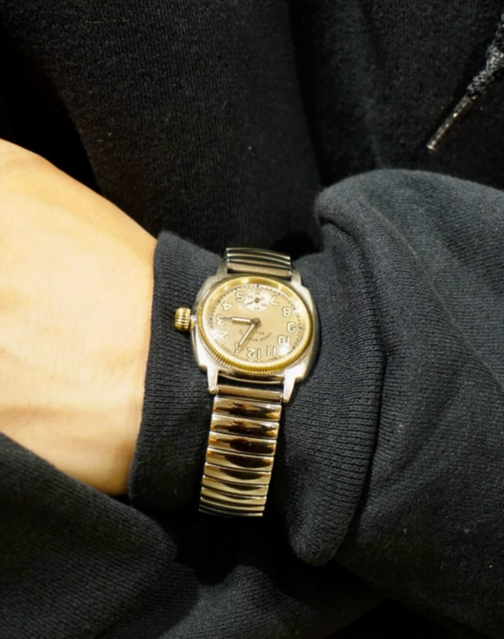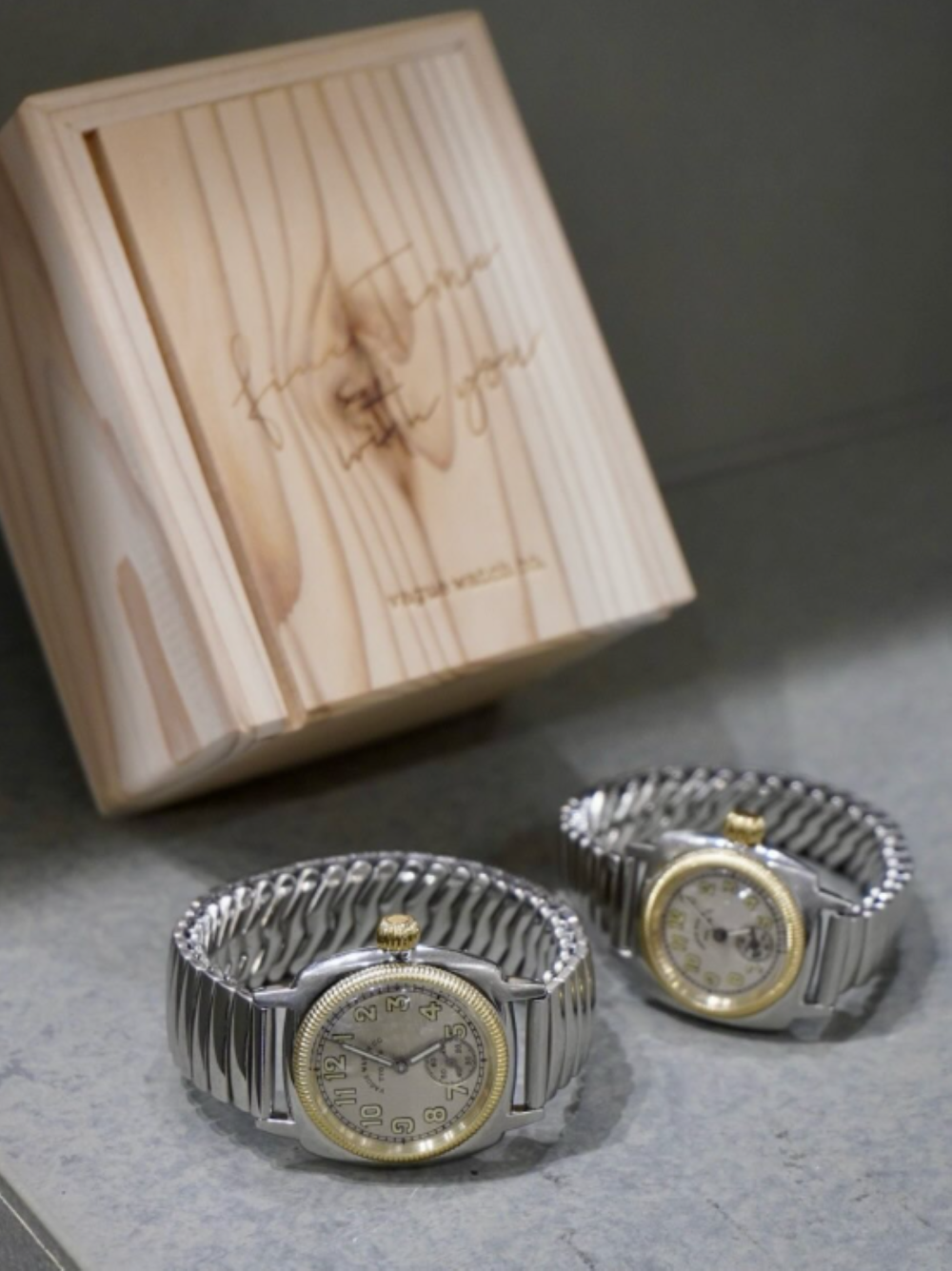 本体ケースはエージング加工が施されたレトロな雰囲気。伸縮自在なベルトを使用している為ブレスレットやアクセサリー感覚で着用いただけます!