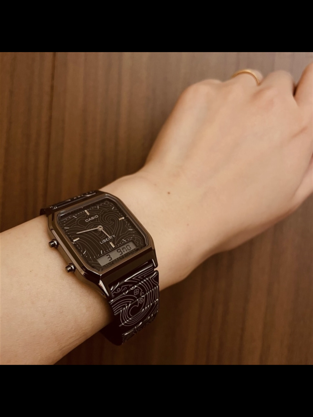 角型フェイスにアナログ時計とデジタル表示を組み合わせた、人気のAQ-230と英国老舗デザインハウスのリバティとのコラボレーションモデル。