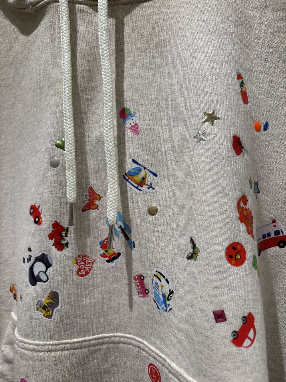 ステッカーのプリントを全面に散りばめられたデザイン。