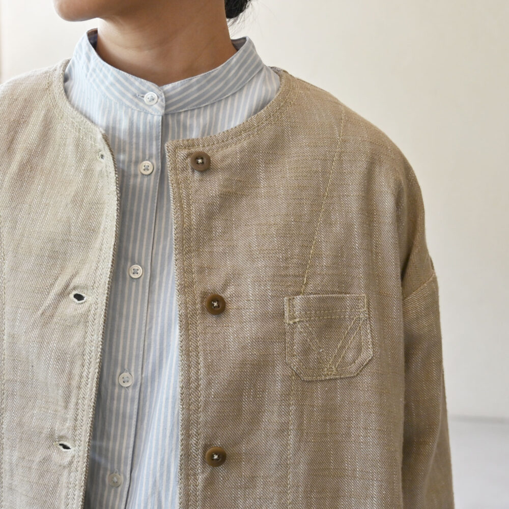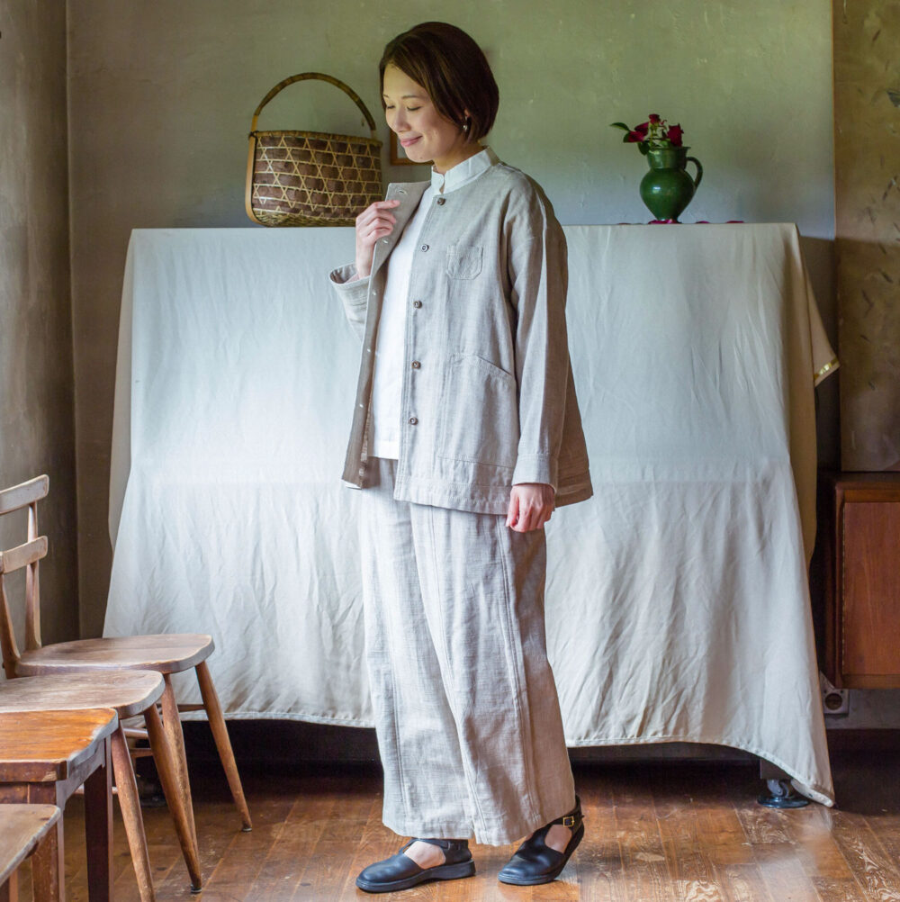 ボトムスにも同じスラブツイル生地を合わせて、上品な大人のスタイリングに。