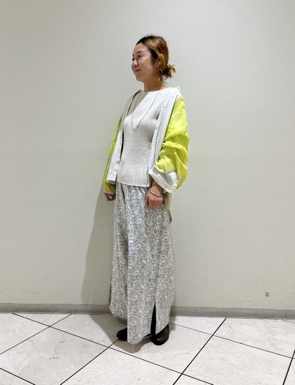 ストールのライム色がコーデのいいアクセントに♪