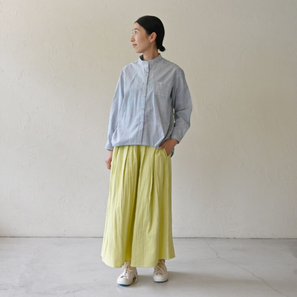 生地にハリがあり、オンにもオフにも万能に着回せるスタンドカラーシャツ。