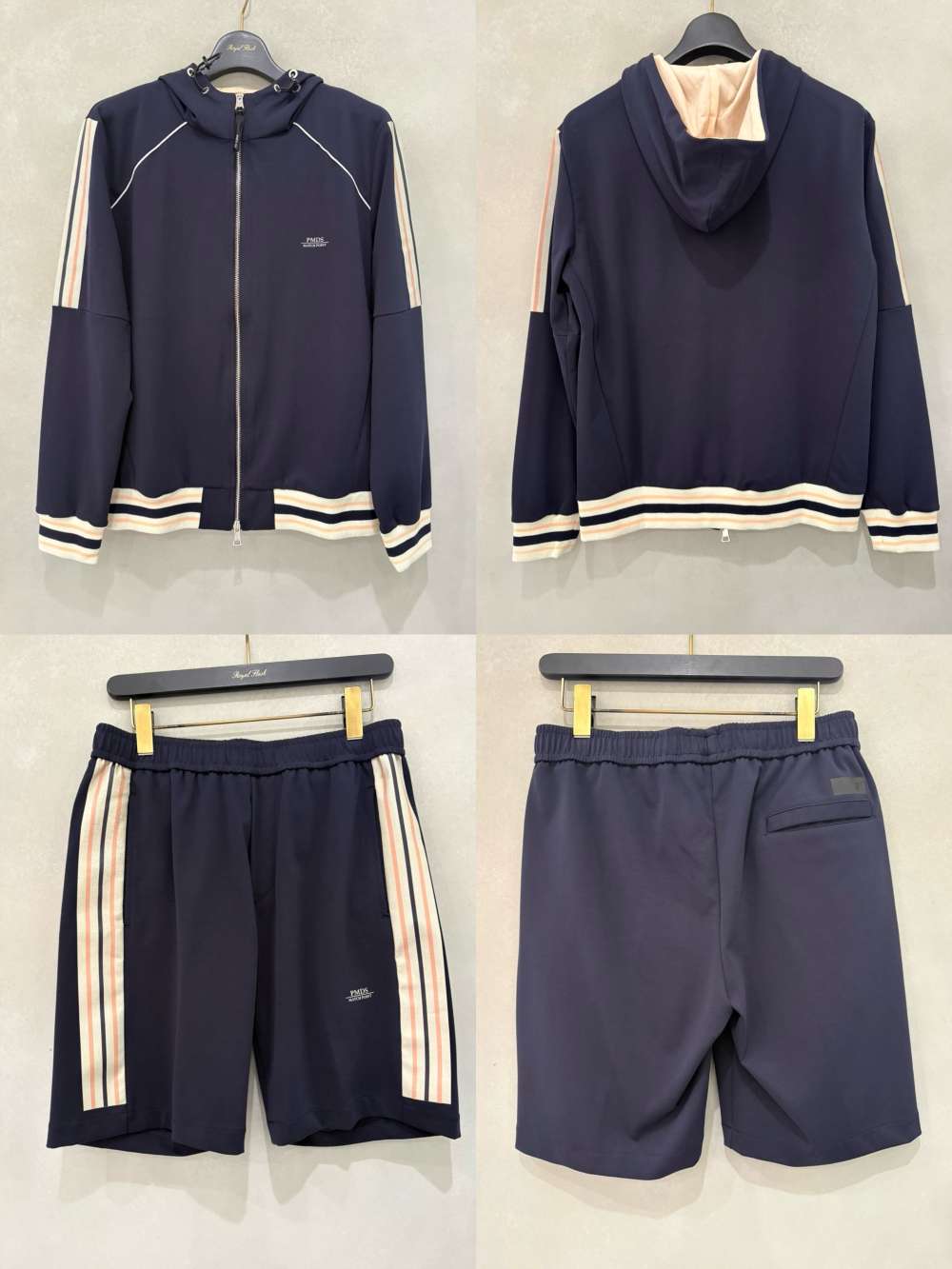 ライン使いでスポーティなアクセントを効かせたセットアップ。スマートなシルエットも手伝って、都会に映える洒脱さが漂います。ジップアップフーディは、フードの裏を切り替えたデザインもアクセント効果大。顔周りが明るく見え、快活なオヤジ像を演出します。ショートパンツの印象的なサイドラインはアクセント効果に加え、縦長感を強調してスタイルアップ効果も発揮。ウエストは360°ゴムシャーリング仕立てで、リラックスした穿き心地も楽しめます。
