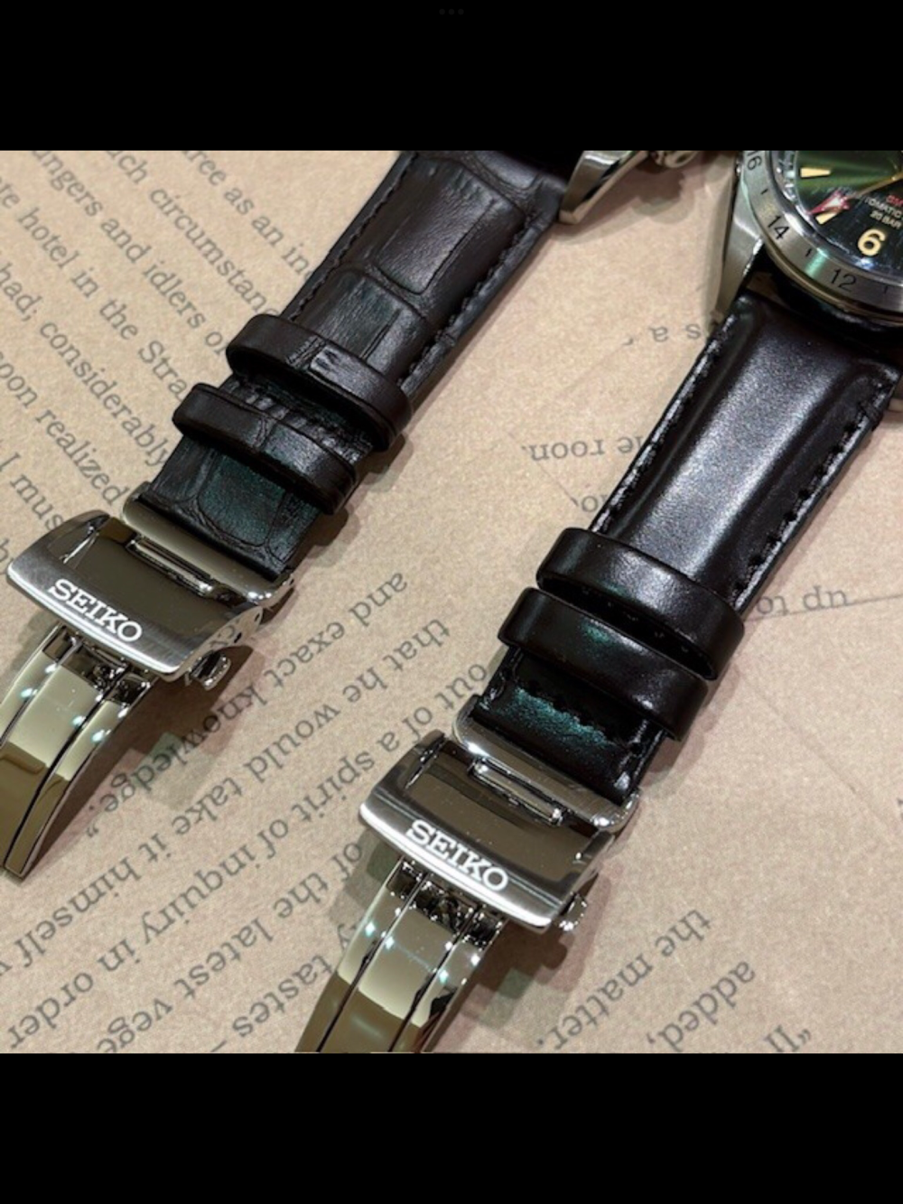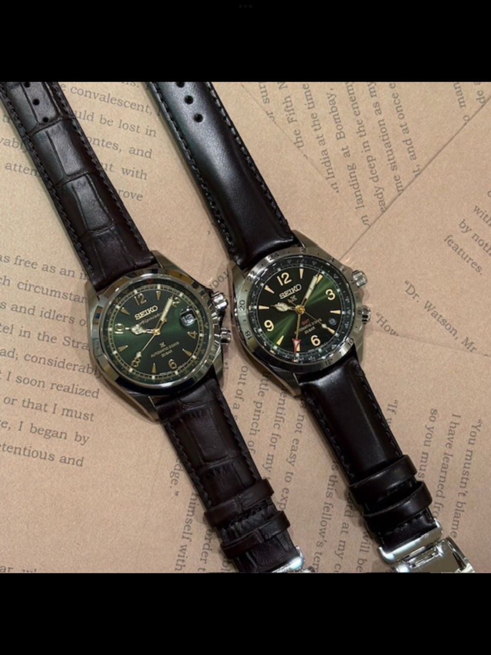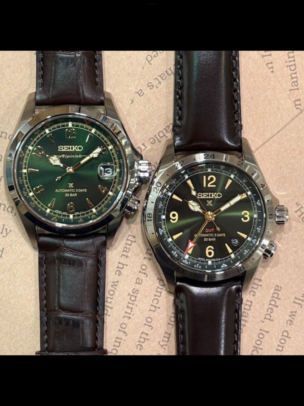 シンプルな3針モデル(左)は、言わずと知れた名作「Alpinist」のロゴをダイヤル12時Seiko下に冠した、伝統を受け継ぐ1本。