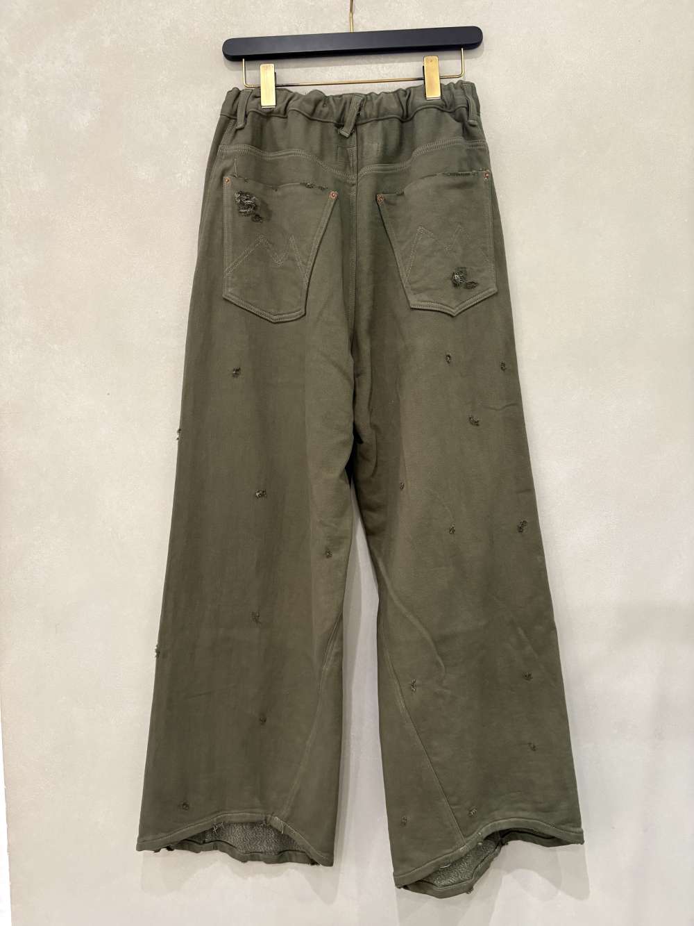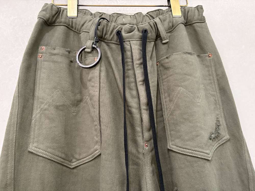 ウエストはゴム仕様としつつベルトループを併設。装飾要素の追加を前提とした拡張性を持つ。