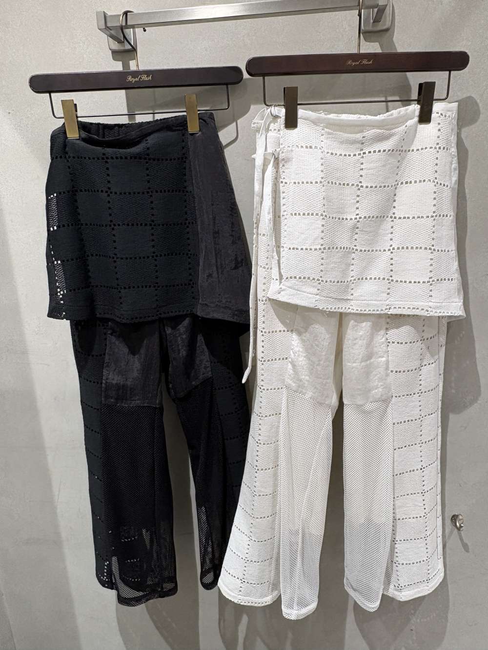透け感の異なる2種類の四角を組み合わせたようなクールな印象のレースを使用したセミフレアパンツ。トレンドライクなスタイルを作れる、取り外し可能なラップスカートのパーツもセットになっている。