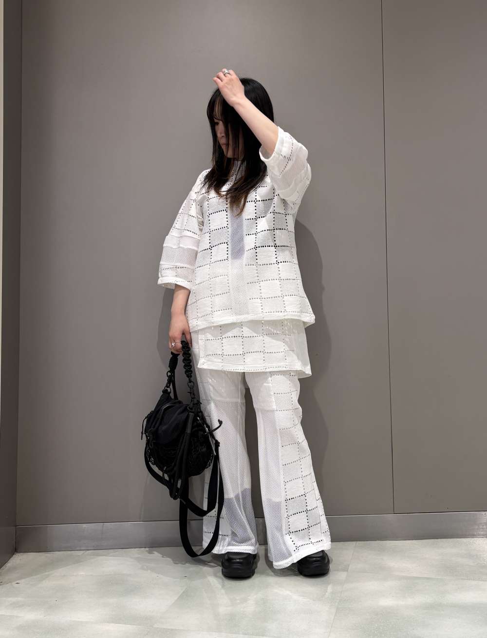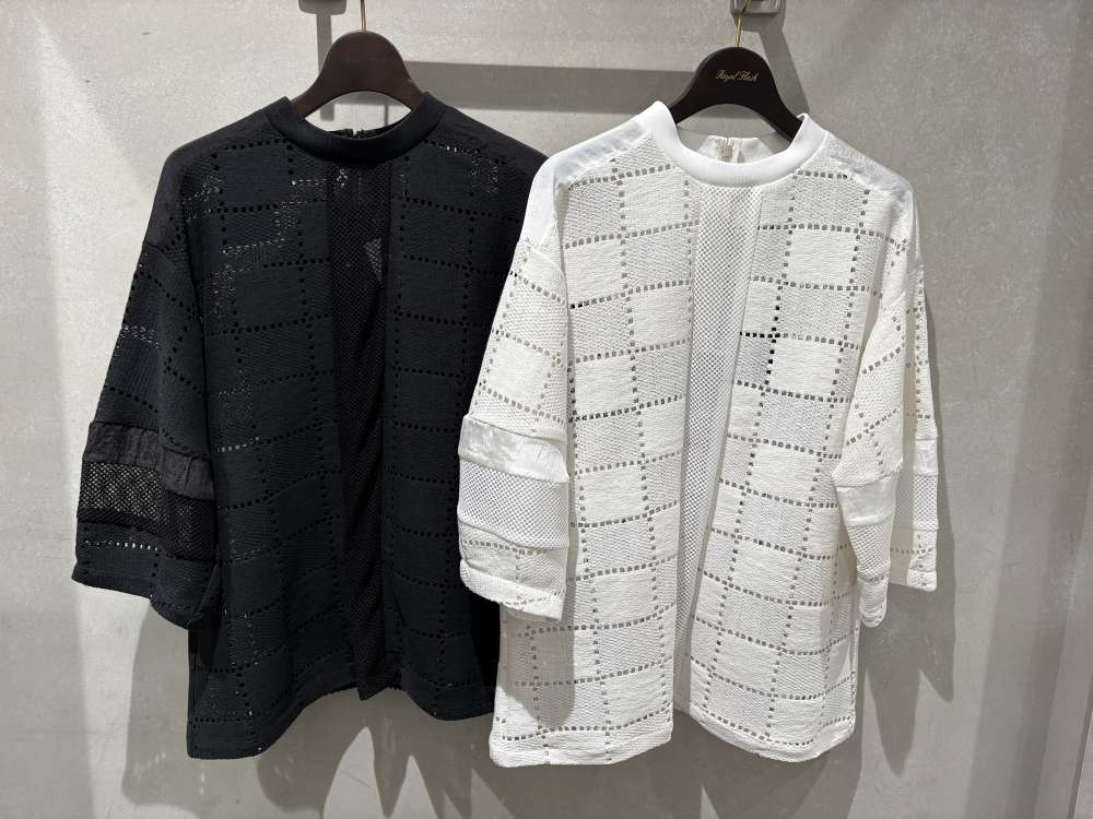 透け感の異なる2種類の四角を組み合わせたようなクールな印象のレースを使用したプルオーバー。