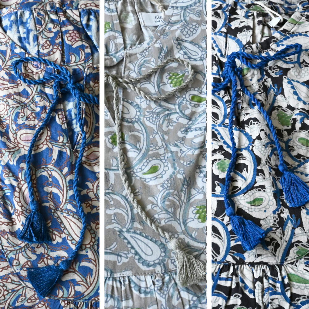 ネックラインにはツイスト紐が付いており、先端にはタッセルが。