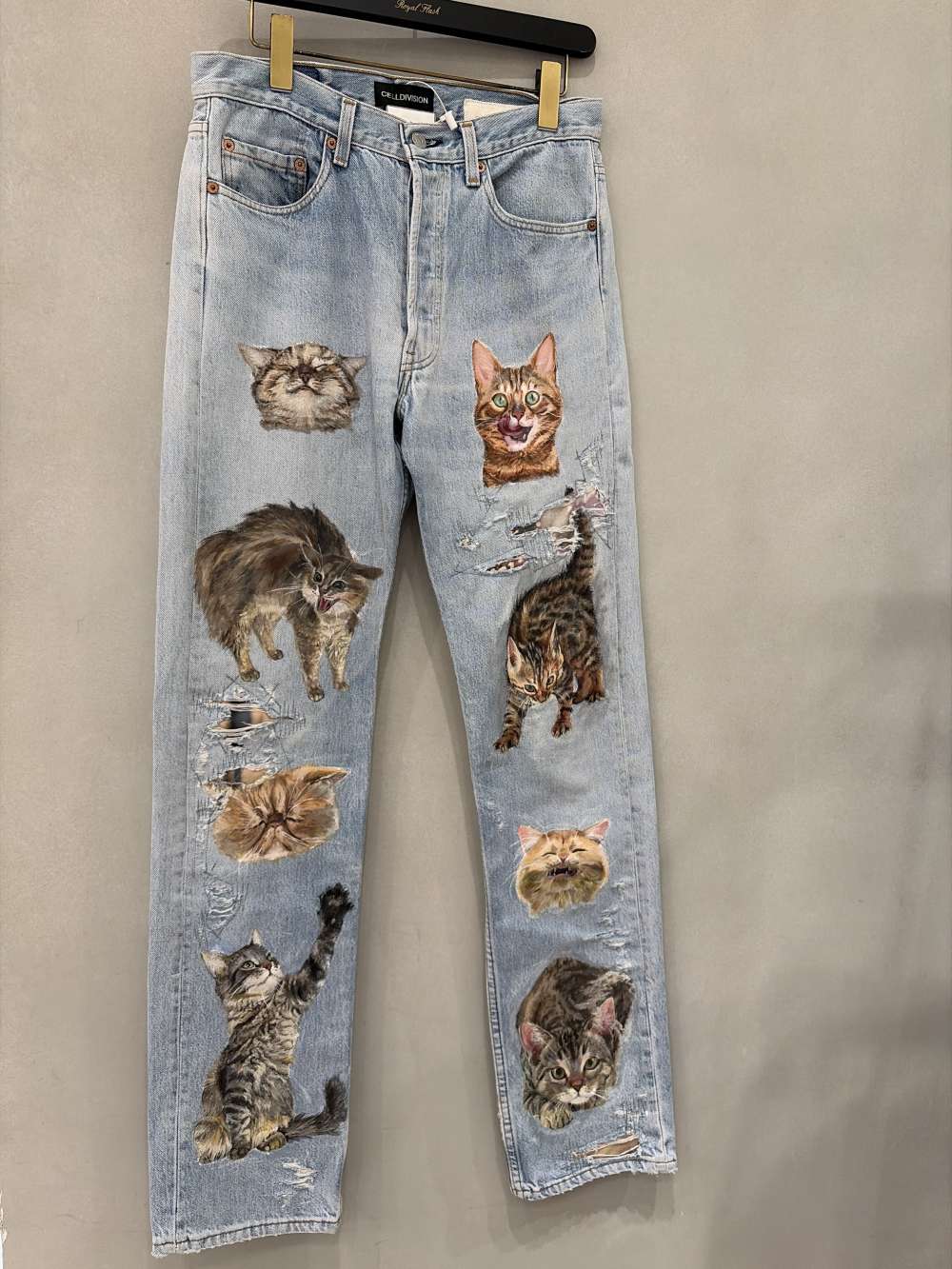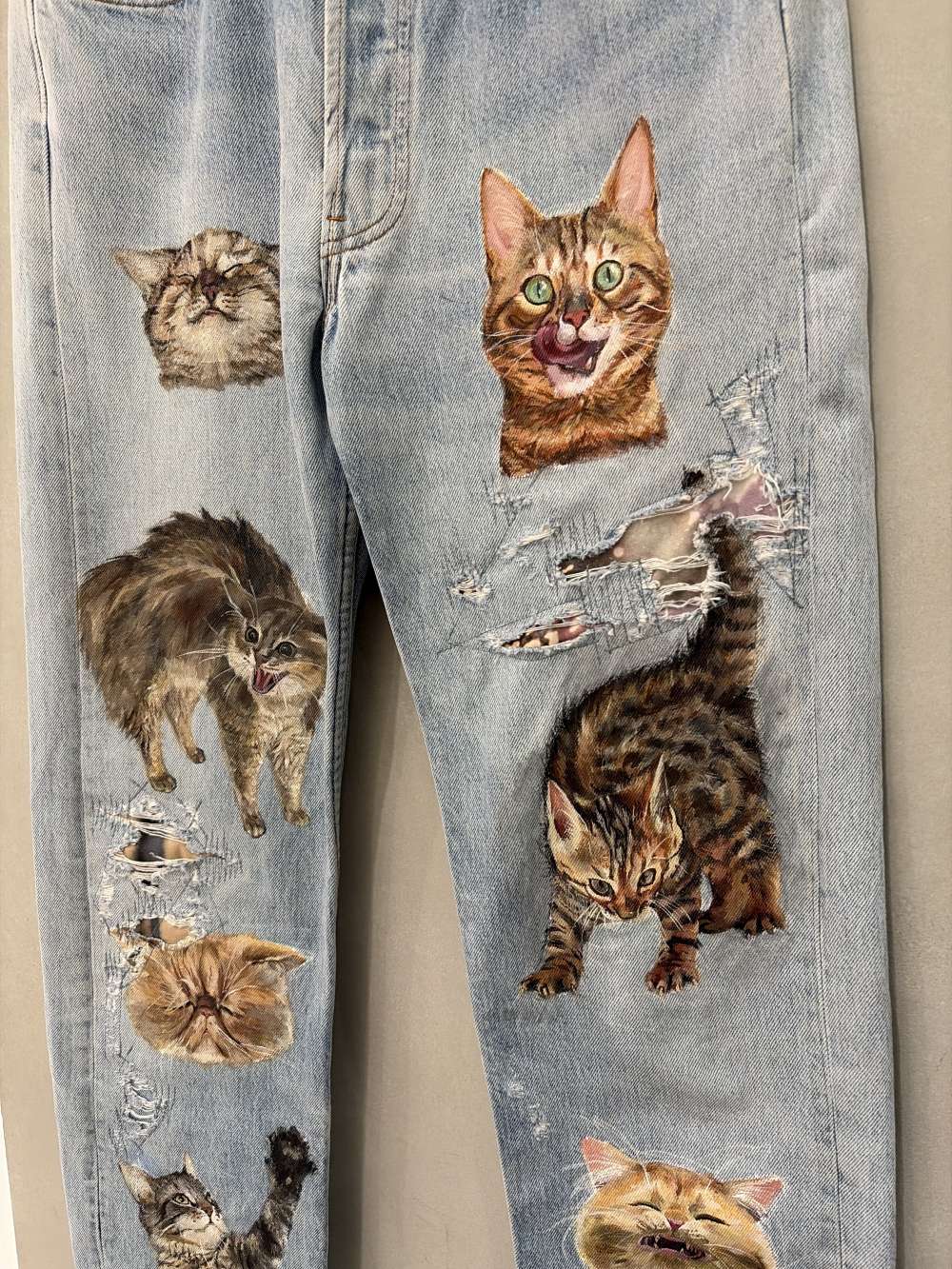 猫がペイントされた一点ものデニム。
