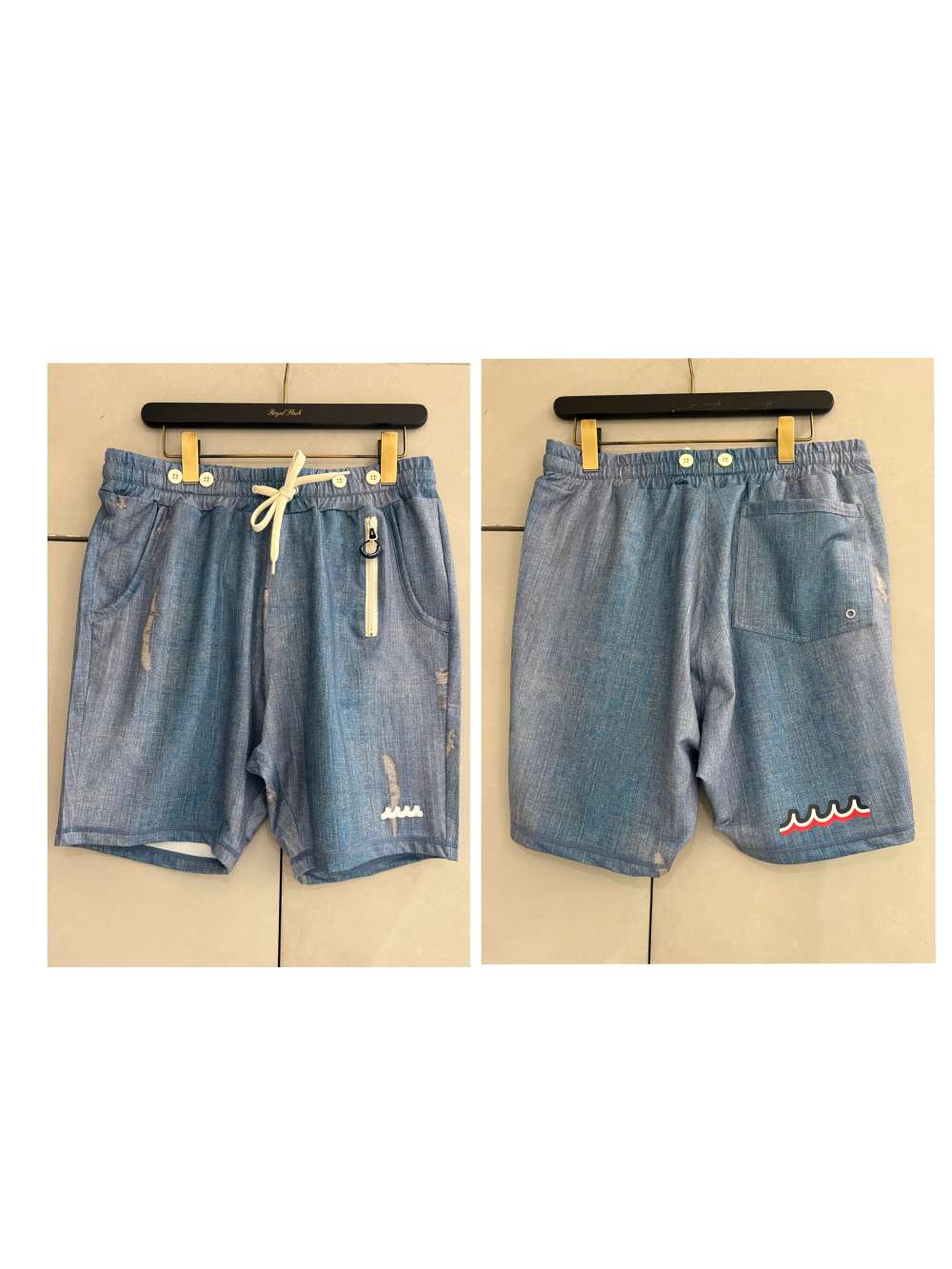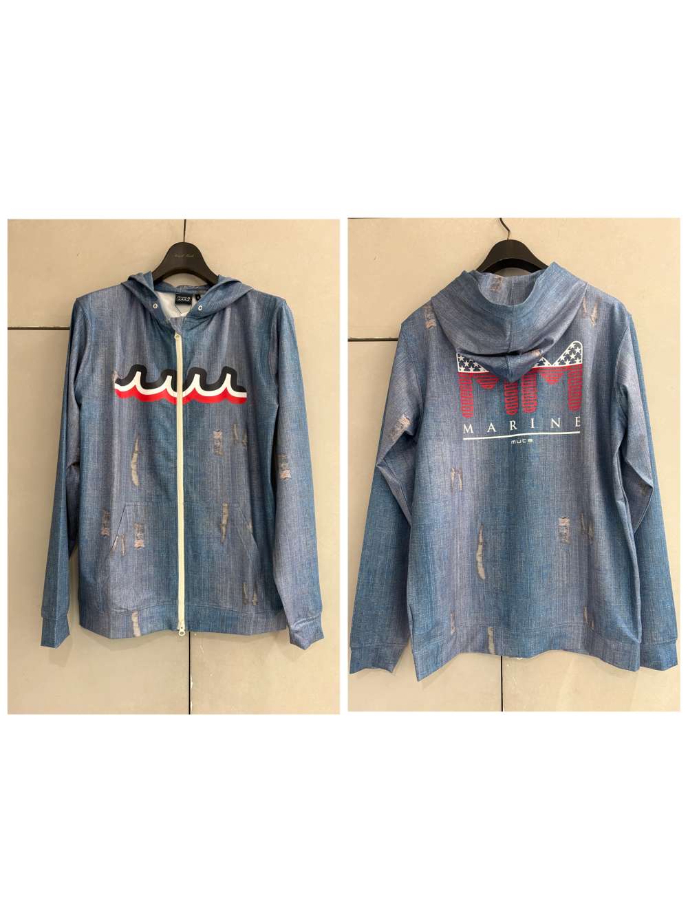 前回好評だったデニム柄にダメージデザインが入ったラッシュガードの上に、フロントとバックにモチーフデザインをこちらで選んでプリントして頂いた限定モデル。